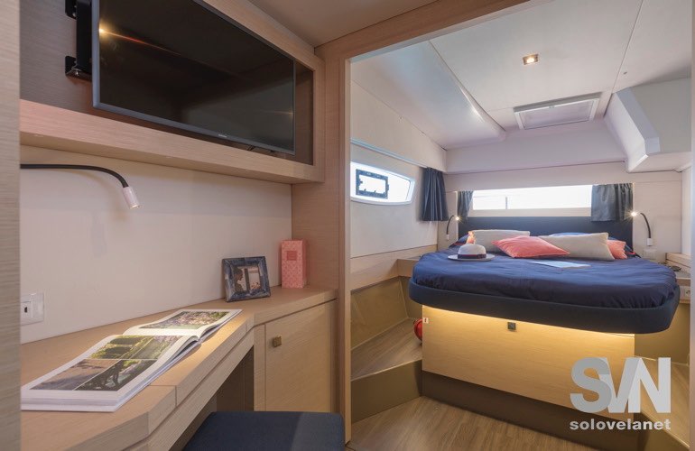 L’Astréa 42, disegnato dallo studio Berret Racoupeau Yacht Design, segue di un anno il Licia 40. Un anno che ha permesso ai disegnatori di elaborare nuove forme per rendere la barca ancora più spaziosa, infatti la differenza di volumi tra il 40 e il 42 non è proporzionato alla differenza di grandezza data dai due piedi in più. L’Astréa 42 è una barca particolarmente grande e comoda in entrambe le sue versioni: la Maestro, che è la versione armatoriale e la Quatour, che è la versione charter con 4 cabine, due per scafo. La costruzione dello scafo è in sandwich di balsa realizzato con la tecnica dell’infusione durante la quale le stuoie di vetro sono impregnate con resina vinilica nei primi due strati e poliestere negli strati successivi. Esemplare dell’ultima generazione dei modelli Fountaine Pajot, l’Astrea 42 rappresenta un ulteriore passo nella trasformazione del cantiere. Fountaine Pajot è passato, negli ultimi 15 anni, dall’essere un produttore di buoni catamarani a vela a diventare produttore di catamarani riconosciuti per l’eleganza e la cura con la quale sono realizzati. Come gli altri modelli di questa generazione, anche l’Astrea 42, si pone come barca pensata e studiata per l’armatore privato, una persona che sa apprezzare le cose belle e soprattutto, le barche eleganti.
