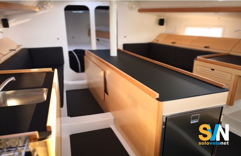 Pogo 12.50, la dinette vista da prua con uno scorcio della cucina