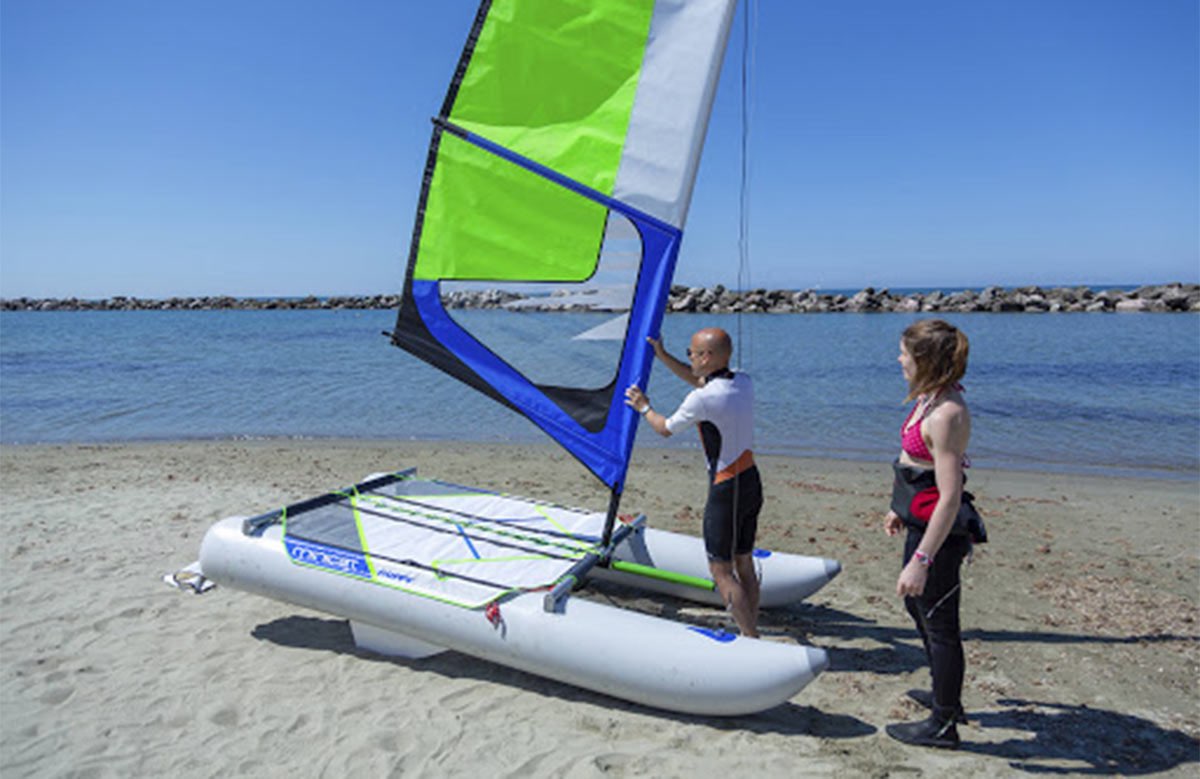 La particolarità di questo prodotto è che il cat sgonfiato sta in una sacca dal peso di soli 28 chilogrammi incluse le vele. In pratica potrebbe essere stivato comodamente in un gavone e gonfiato quando arriviamo in una baia durante la crociera. Per i più giovani, è omologato per due adulti, un divertimento assicurato e alternativo al tender. La randa per ragioni di sicurezza è armata senza boma.