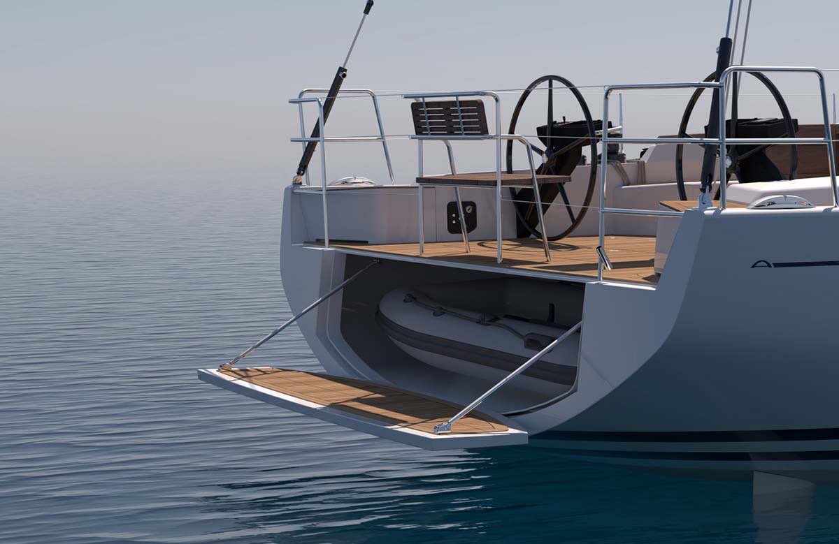 A poppa trova spazio un ampio tender garage, mentre in pozzetto è interessante la soluzione del doppio tavolino: invece del classico tavolo grande in posizione centrale sull’Arcona 50 è come se fossero due i tavoli pieghevoli, che in posizione di riposo lasciano il passaggio al centro del pozzetto libero, cosa che con il tavolo singolo non avverrebbe.