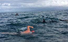 Adam stava nuotando quando ha visto avvicinarsi un grande squalo bianco. Era pronto a saltare sulla barca appoggio, come fa ogni volta che vicino a lui si materializzano sagome pericolose, ma poi è successa una cosa strana: un gruppo di 7 delfini (pod) lo hanno circondato e hanno continuato a nuotare intorno a lui, come si vede sul video, sino a quando lo squalo non si è allontanato.