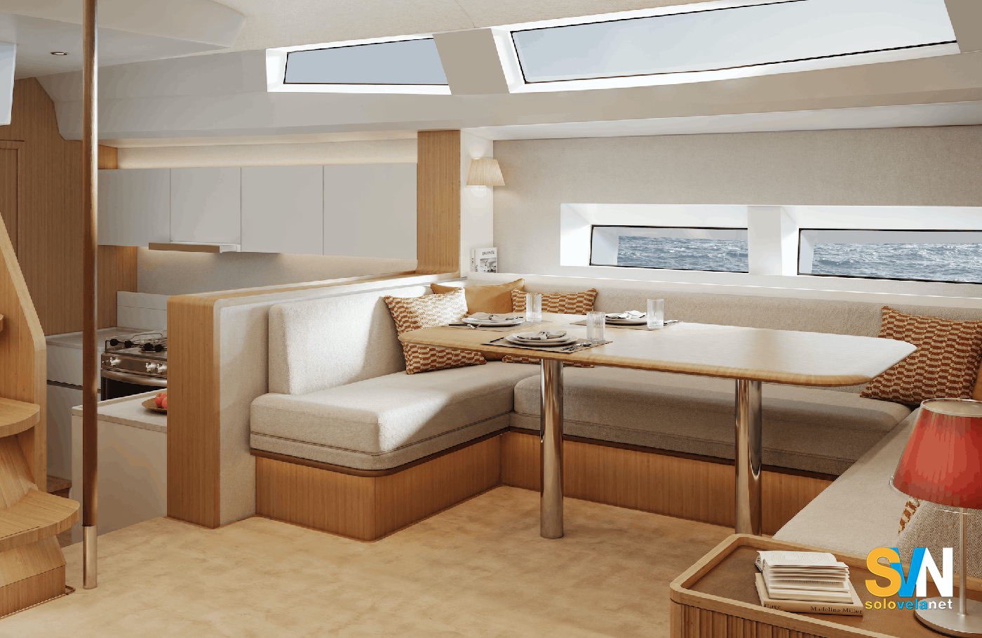 Sottocoperta, l’articolazione degli spazi combina funzionalità e relazione con il mare. L’ampio salone, illuminato da grandi finestrature laterali e da una tuga panoramica, si integra con una cucina aperta, configurata per favorire la convivialità sia in navigazione sia all’ancora.