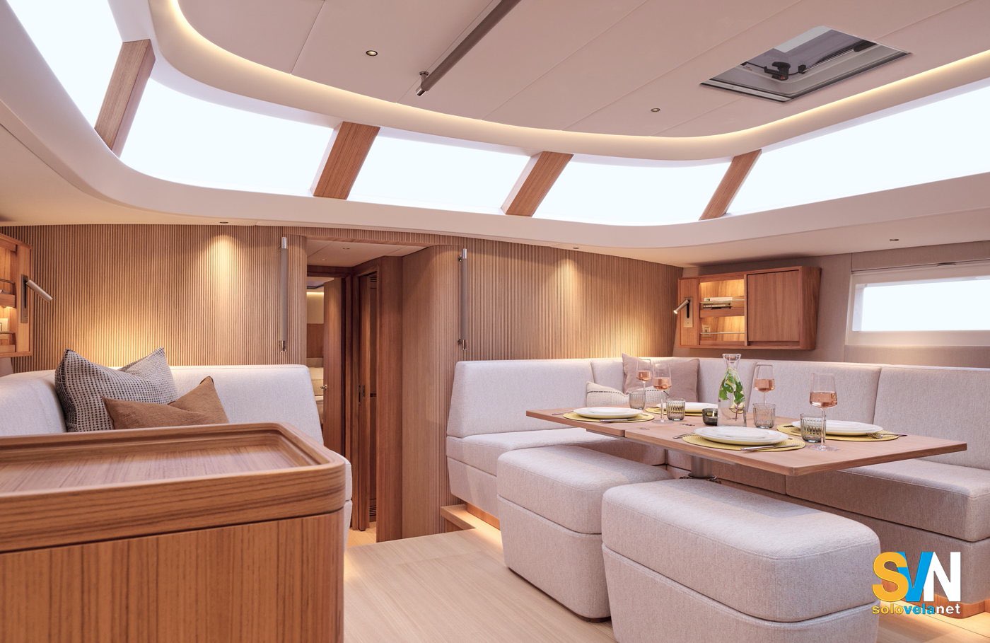 L’elemento più caratterizzante della coperta è il nuovo hard-top bimini opzionale. Non una semplice protezione solare, ma una struttura multifunzionale che integra pannelli solari, una finestratura posteriore per il controllo diretto della randa e un punto di rinvio centrale per la scotta, che libera il pozzetto anteriore da cime e rinvii. La possibilità di chiudere lateralmente e posteriormente l’area del pozzetto crea una zona riparata per la navigazione e la vita a bordo anche in condizioni climatiche non ideali.