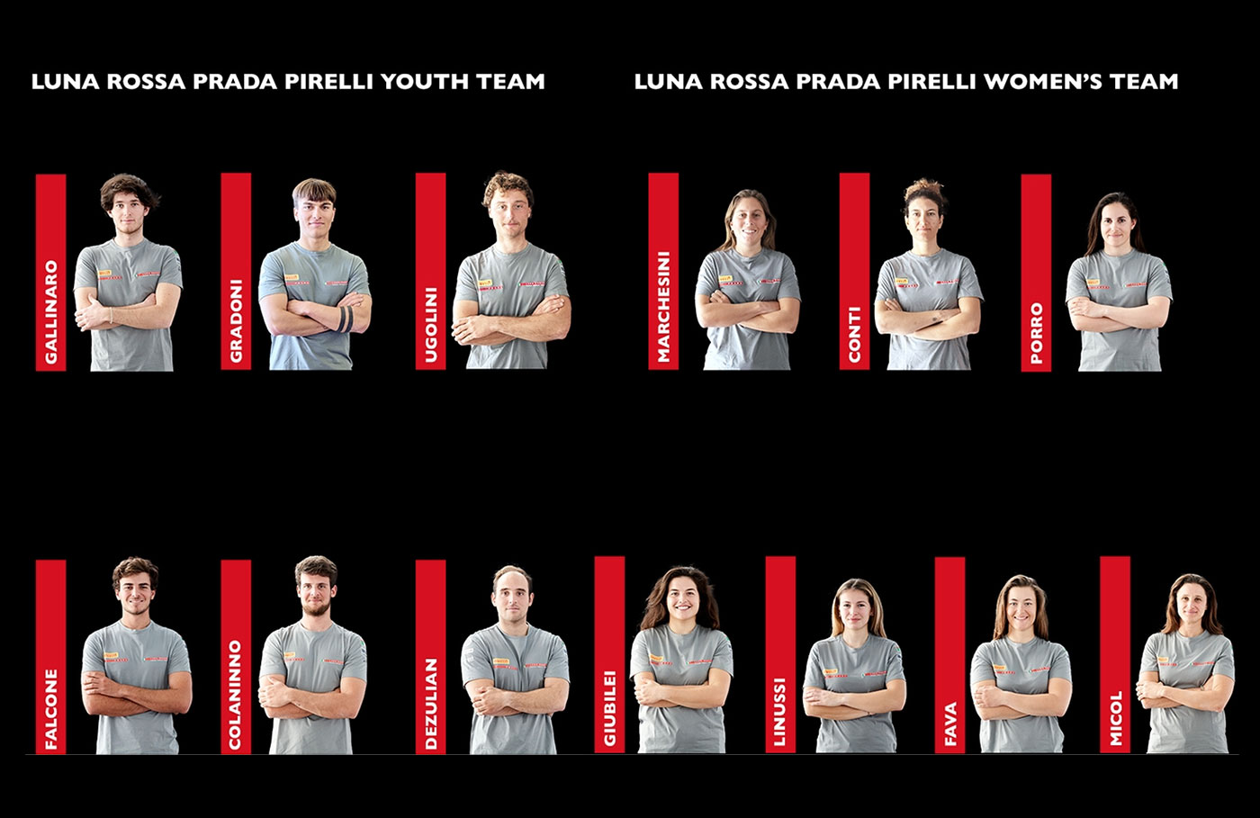 I giovani scelti, anche l’oro attraverso un lungo iter di selezione, sono: Guido Gallinaro (timoniere), Gianluigi Ugolini (timoniere), Federico Colaninno (trimmer), Stefano Dezulian (trimmer) e Rocco Falcone (timoniere/trimmer). Anche Marco Gradoni (timoniere), che è già membro del sailing team di Luna Rossa Prada Pirelli, è stato convocato nell’equipaggio Under 25.