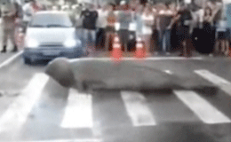 Un grosso esemplare di leone marino è risalito dalla vicina spiaggia andando a finire sul corso principale, qui, in osservanza alle leggi che regolano il traffico, l’animale, ha attraversato la strada sulle strisce pedonali provocando la paralisi del traffico.