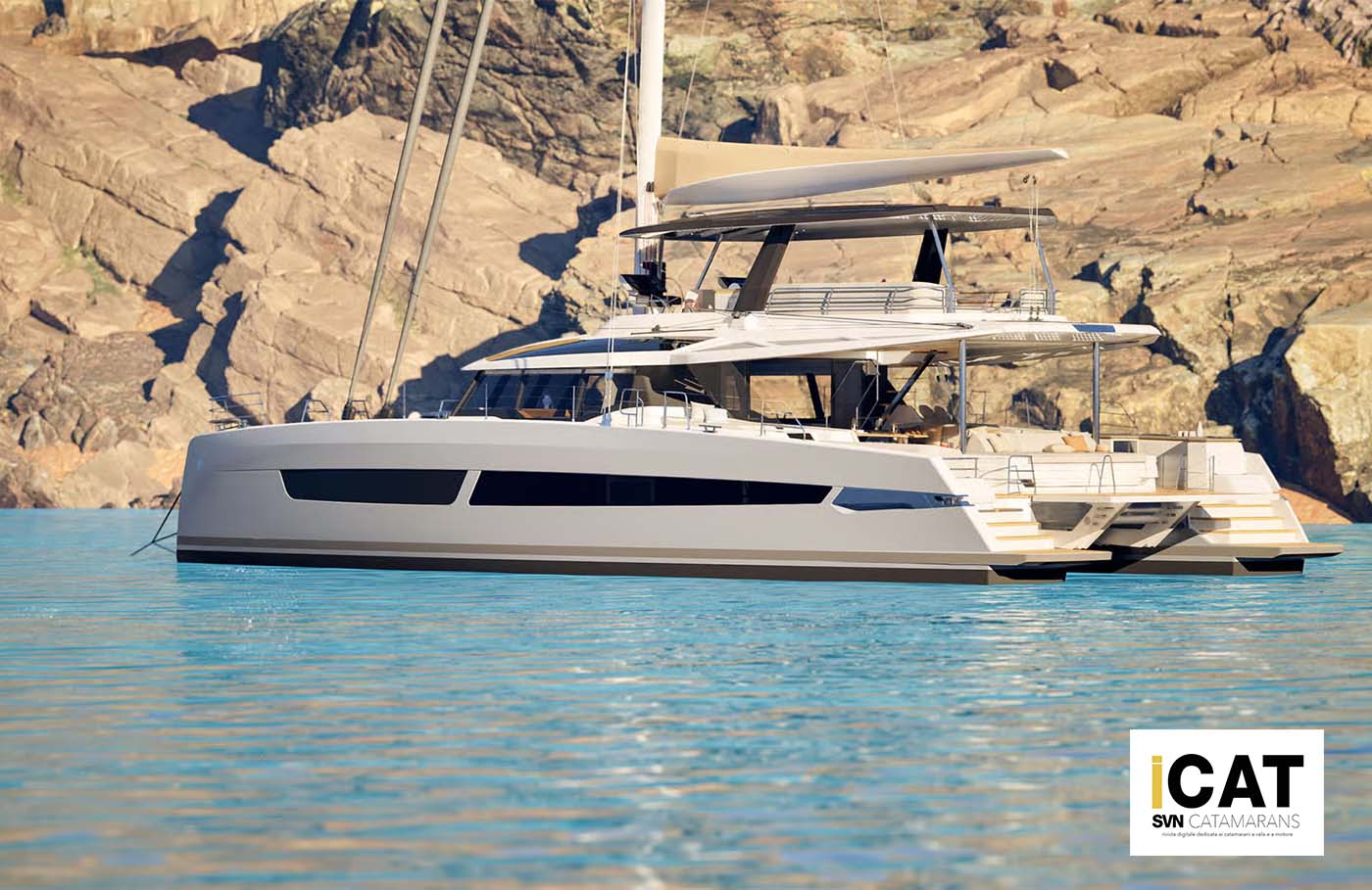 L’eliminazione dei trampolini consente di guadagnare superfici fruibili anche in navigazione e rende più sicuro il movimento dell’equipaggio. L’accesso diretto dal quadrato alla prua e l’organizzazione degli spazi esterni favoriscono la continuità tra vita di bordo e mare, mentre l’impostazione strutturale e la distribuzione dei pesi restano quelle tipiche di un catamarano dalle buone prestazioni a vela e dalla grande stabilità.