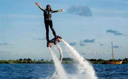 Non facilissimo da usare, ma molto divertente, il Flyboard consiste in una piccola piattaforma montata su degli ugelli, sulla piattaforma sono fissati degli scarponi. Dalla piattaforma parte un grosso tubo lungo una quindicina di metri che raggiunge una moto d’acqua. La moto, che ha un motore idrogetto, spara nel tubo acqua ad alta pressione che quando esce dagli ugelli fa alzare in volo il Flyboard.