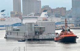 Il padiglione ha navigato sino al suo posto definitivo con le casse di zavorra vuote e con un pescaggio di nove metri. Ora le casse saranno allagate e il padiglione scenderà di 80 centimetri sino a toccare il fondo che è stato preparato a riceverlo con un lungo lavoro di scavo e livellamento.