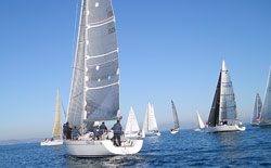 Trenta scafi in acqua, piegati inizialmente dal vento proveniente da est-sud-est che soffiava a 10 nodi e dopo la prima bolina da sud-est secco. Mare pressoché calmo e verso la fine della gara, caratterizzato da onda lunga da libeccio. Sole a sprazzi, delfini in mezzo ai concorrenti ed a curiosare nei pressi della barca giuria. Da registrare anche un bel tuffo in mare dall’imbarcazione Settebordi.