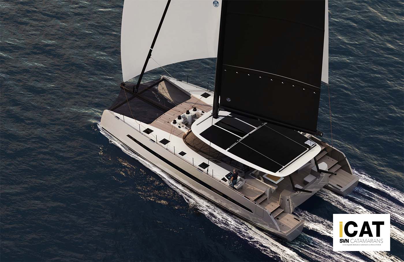 Il sistema di manovre centralizzate consente di condurre il catamarano anche in due persone, con grande controllo e sicurezza. Il cantiere punta su un concetto di crociera ad alte prestazioni, dove comfort ed efficienza convivono.