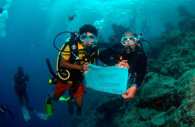 La protesta organizzata dai sommozzatori ha voluto anche ricordare lo spettacolare consiglio dei ministri che nel 2009 l'allora presidente Nasheed organizzò sott'acqua in cui si sottolineò il pericolo derivato dallo scioglimento dei ghiacci polari e il conseguente aumento del livello dei mari che mettono in pericolo le isole di bassa altitudine come le Maldive.
