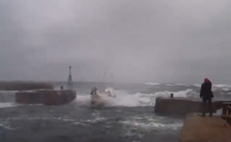 La barca sembra sfidare l’impossibile e tenta l’entrata. Viene sballottata dalle onde, ma comunque riesce a tenere la rotta, una planata ed è dentro il porto dove non gli rimane che evitare lo scoglio che gli si para davanti.