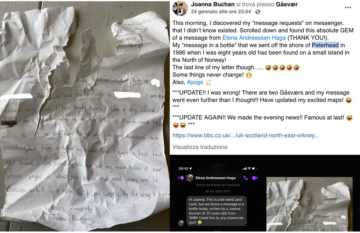 Elena Andreassen aveva provato subito a contattare Joanna, ma il messaggio era rimasto nel dimenticatoio dei “non letti” di Messenger, nascosto con la storia della sua bottiglia in un suggestivo incrocio tra messaggi su carta che hanno attraversato per anni l’Oceano e quelli digitali, che il mondo si scambia oggi.