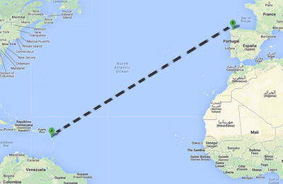 Percorso modificato in un'unica tappa - da Sada (Spain) a Pointe-à-Pitre: 3700 miles