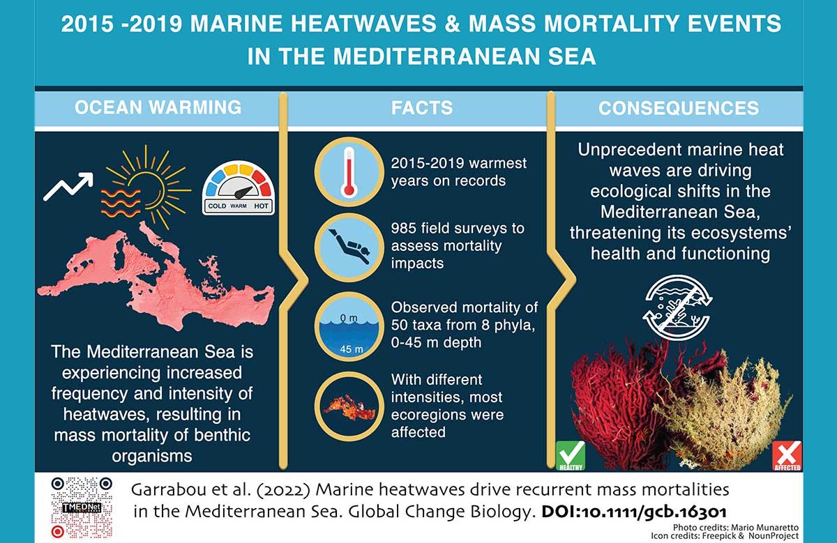 Tra il 2015 e il 2019 una serie di ondate di calore ha colpito tutte le regioni del bacino mediterraneo, provocando eventi di mortalità di massa in 50 diverse specie marine come coralli, spugne, macroalghe e anche pesci. Questi fenomeni hanno interessato migliaia di chilometri di coste mediterranee, dal Mare di Alboran sino alle coste orientali, tra la superficie e i 45 metri di profondità.