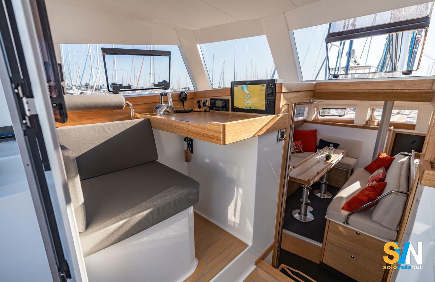 Il layout interno è uno dei punti chiave del nuovo progetto. L’Ovni 490 introduce una pilot-house vetrata che consente di navigare restando all’interno, con piena visibilità a 360°. La postazione di carteggio e la seduta accanto offrono un ambiente riparato e luminoso, mentre sotto coperta gli spazi sono configurabili: la versione standard prevede tre cabine e due bagni, ma sono disponibili varianti a due cabine con grande zona tecnica o officina. I materiali interni, come legni chiari e rivestimenti lavabili, privilegiano praticità e durabilità più che l’estetica, coerentemente con la filosofia del cantiere.