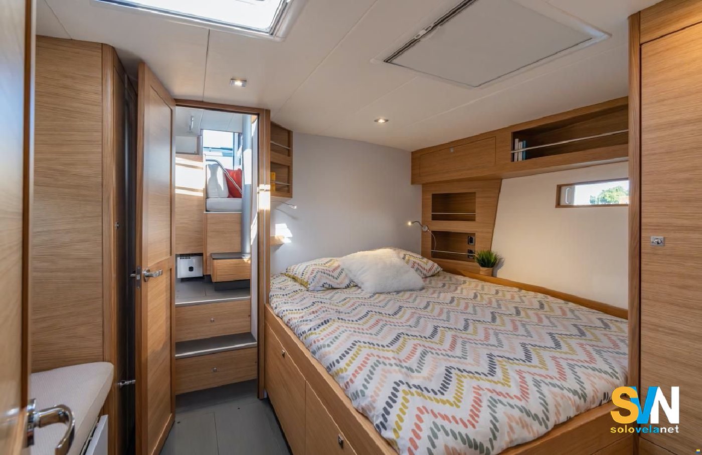 Il pozzetto è ampio e protetto, con doppia ruota del timone e un passaggio centrale libero che facilita l’accesso alla piattaforma di poppa. Le manovre principali sono rinviate al pozzetto, rendendo l’Ovni 490 gestibile anche in equipaggio ridotto. A prua si trova un grande gavone per le ancore e lo spazio per un eventuale verricello secondario. È prevista la predisposizione per pannelli solari e generatore eolico, segno della vocazione oceanica del modello.