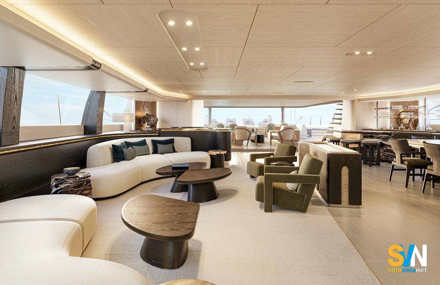 L’albero, realizzato da Rondal in fibra di carbonio, raggiunge i 93 metri di altezza, una misura che supera quella della Statua della Libertà. Le proporzioni raccontano subito l’ambizione del progetto: costruire una barca a vela capace di competere in termini di efficienza e tecnologia con le unità a motore della stessa fascia di lusso.