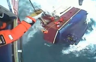 Ad un certo punto questa si è girata di lato tanto che i cinque uomini dell’equipaggio sono dovuti strisciare sul fianco della barca. Due di loro sono riusciti a salire su di una scialuppa, mentre gli altri tre, grazie alla pronta risposta da parte dell’equipaggio dell’elicottero, sono stati tratti in salvo e tirati su prima che la barca affondasse.