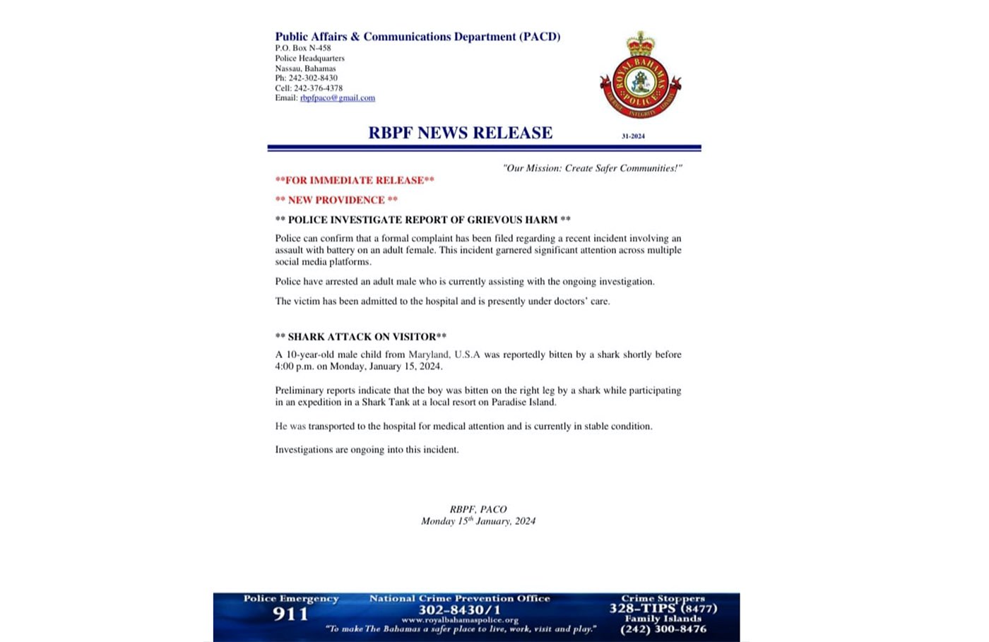 Un bambino di 10 anni, originario del Maryland, è stato attaccato il 17 gennaio da uno squalo, durante un’immersione in una “shark tank” alle Bahamas, più precisamente a Paradise Island. La vittima è stata trasportata in ospedale, dove sono state riscontrate ferite al braccio destro, ma le sue condizioni sono state definite stabili.