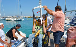 Il progetto è stato realizzato adeguando la testata del pontile centrale (B) per renderla idonea all’installazione di un pequod e rendere agevole l’ormeggio delle imbarcazioni destinate ad imbarcare o sbarcare i diversamente abili. Questi potranno accedere a bordo (o essere sbarcati) con l’ausilio di un sollevatore (pequod) appositamente progettato ed omologato per quella finalità. Inoltre è stata cura di questa sezione abilitare proprio personale e soci volontari per la esecuzione delle operazioni di cui si è detto e per l’assistenza alle persone nel tragitto di trasferimento da e per le imbarcazioni.