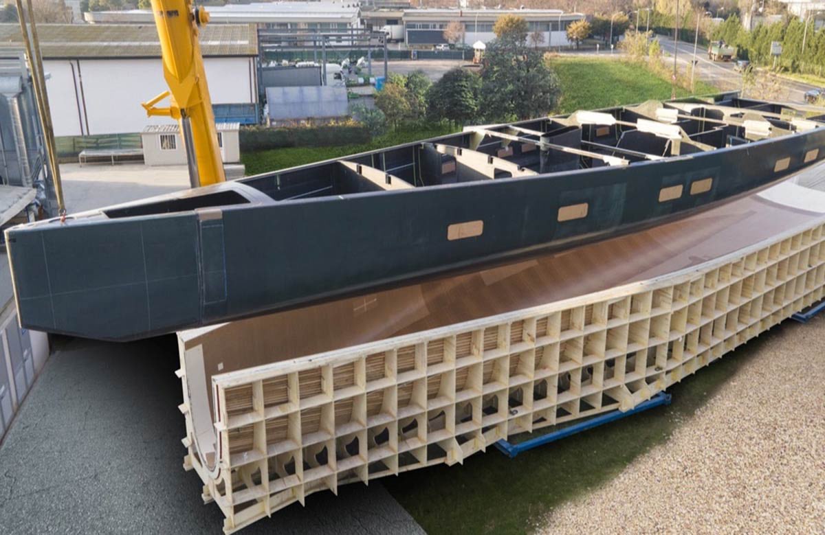 I maestri d'ascia stanno già installando le paratie che divideranno lo spazio interno, con cablaggi, tubature, serbatoi e altre componenti ingegneristiche, mentre la coperta in carbonio leggero è attualmente in fase di stampaggio.